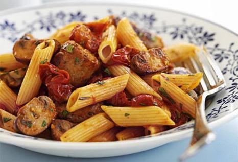 Πριν τα σουρώσουμε ρίχνουμε 2-3 κουταλιές από το νερό τους στη σάλτσα. Μόλις τα σουρώσουμε τα βάζουμε στο τηγάνι με τη σάλτσα, τα ανακατεύουμε καλά και τα σερβίρουμε αμέσως.