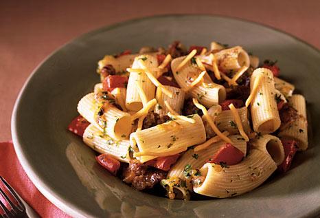 Προθερμαίνουμε το φούρνο στους 200 βαθμούς. Ανακατεύουμε το κρεμμύδι, τις κόκκινες πιπεριές και το σκόρδο με 1 κουταλιά της σούπας ελαιόλαδο και ψήνουμε για 25 λεπτά, ανακατεύοντας περιστασιακά. Αφαιρούμε την εξωτερική μεμβράνη από τα λουκάνικα, λιώνουμε το εσωτερικό και σοτάρουμε μέχρι να πάρει ένα καφέ χρώμα. Αφαιρούμε από το σκεύος και στραγγίζουμε από το λίπος σε χαρτί κουζίνας. Καθαρίζουμε το σκεύος από το λίπος και επαναφέρουμε τη γέμιση από τα λουκάνικα. Προσθέτουμε τη μπύρα και αφήνουμε να πάρει μία βράση. Μαγειρεύουμε μέχρι να εξατμισθεί η μπύρα. Βράζουμε τα ζυμαρικά σε αρκετό νερό με αλάτι, στραγγίζουμε και κρατάμε ½ κούπα από το νερό που βράσανε. Αφαιρούμε τα ψημένα λαχανικά από το φούρνο και ανακατεύουμε με την ψίχα από τα λουκάνικα, το βασιλικό, τα ζυμαρικά και 1 κούπα από το τριμμένο τυρί. Αν χρειαστεί, προσθέτουμε και λίγο από το νερό που βράσαμε τα ζυμαρικά, προκειμένου να δημιουργήσουμε ένα υδαρές μείγμα. Πασπαλίζουμε με το υπόλοιπο τυρί και σερβίρουμε όσο είναι ζεστά.