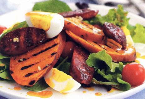Ρίχνουμε το σκόρδο για 30 δευτερόλεπτα στο λάδι και προσθέτουμε το χυμό του λεμονιού. Μοιράζουμε σε 4 πιάτα τη γλυκοπατάτα, τα αυγά κομμένα στα τέσσερα, τα ντοματίνια, το λουκάνικο και την πράσινη σαλάτα και περιχύνουμε με το ζεστό ντρέσινγκ. Καλή όρεξη!